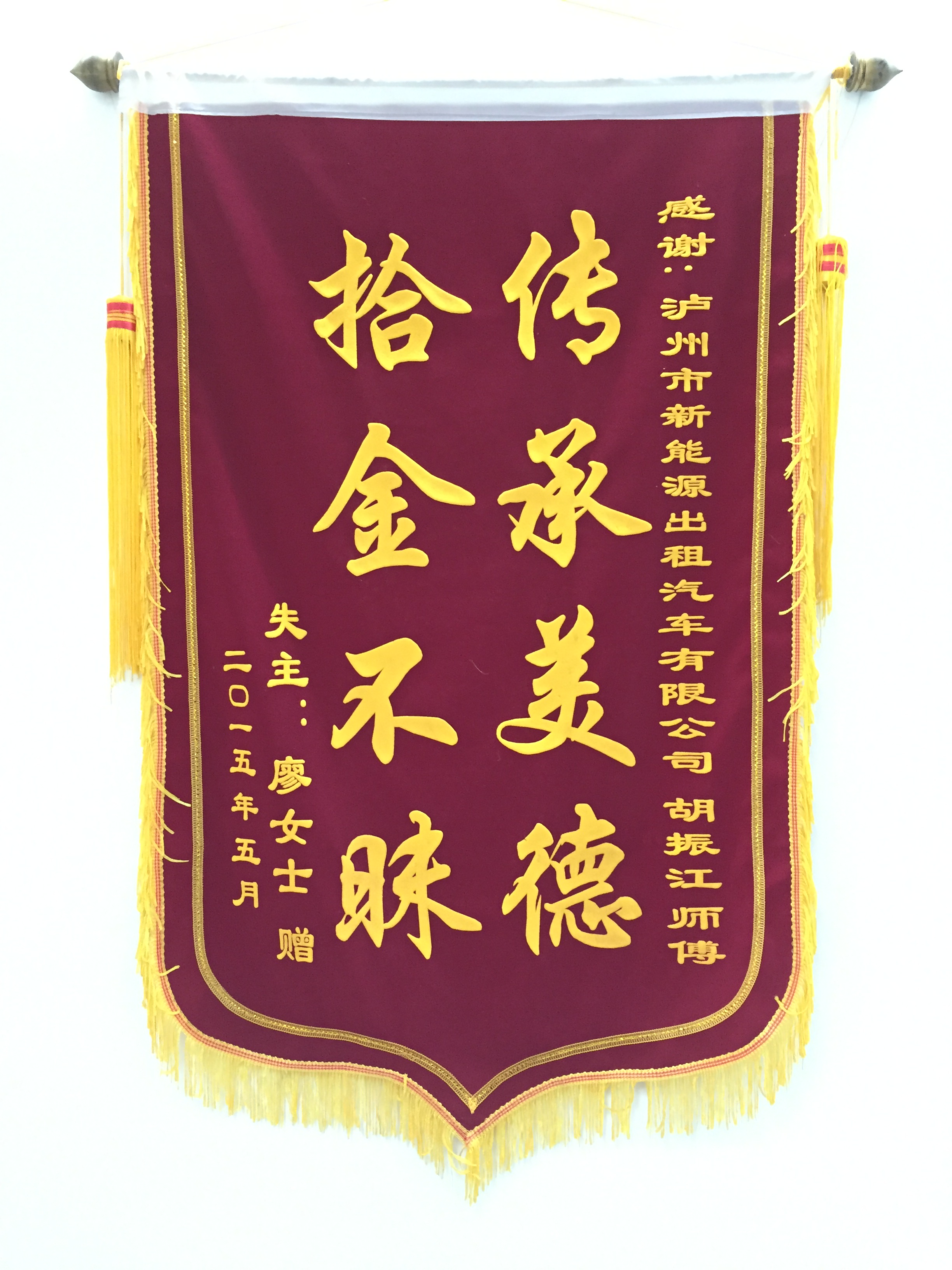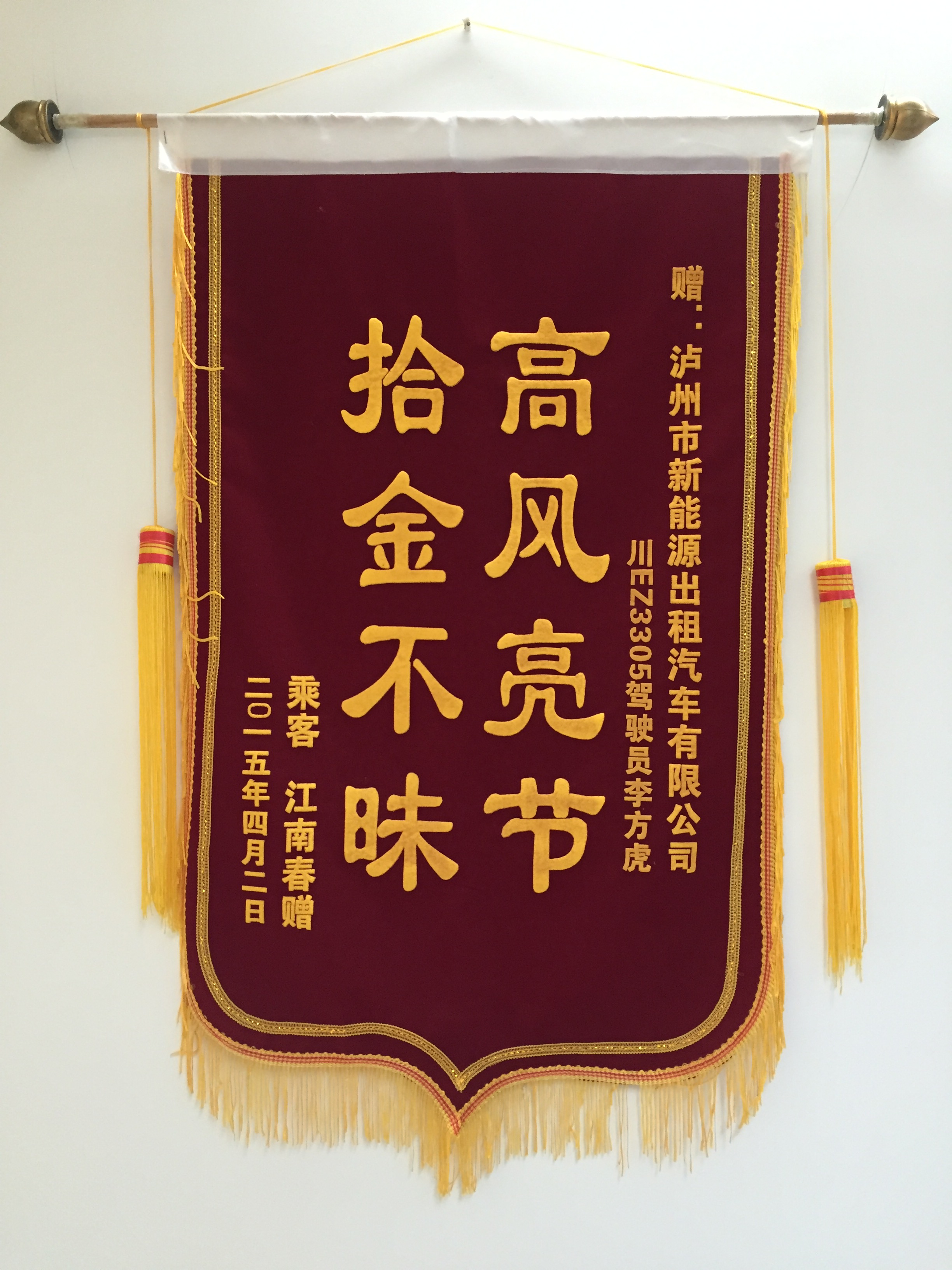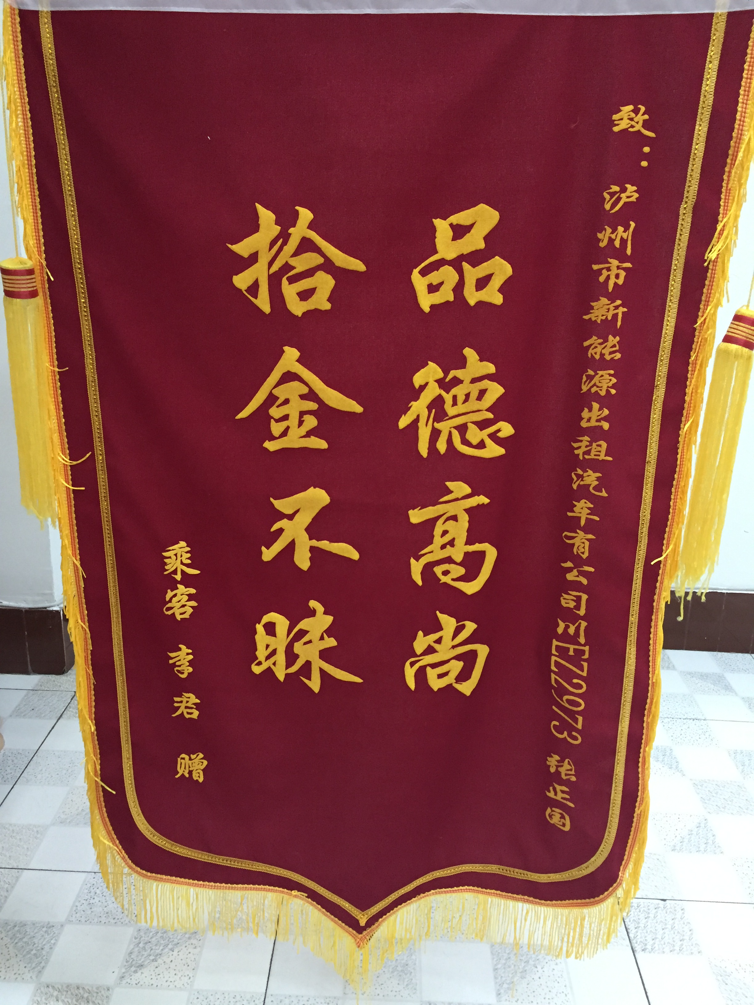 川EA38B3駕駛員袁宏民7月30日拾到三星手機一部,已交還乘客。乘客送來錦旗感謝